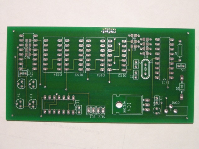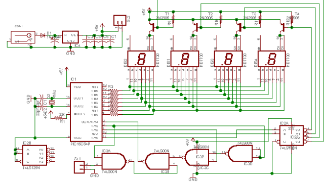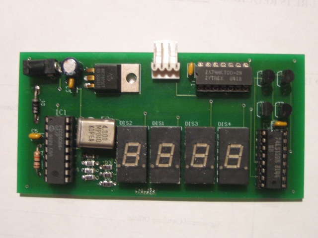 The first picture shows the bare printed circuit board. The next picture shows the board assembled. The last picture shows my creation displaying a known frequency from a commercial signal generator. Both displays show the same frequency. Not bad!!! After my design goes through a rigorous testing face in my hot garage, I may offer the bare pcb for a nominal fee to cover manufacturing expenses. The size of this board is about 2 by 4 inches. The code will be offered free. You can program your own pic microcontroller or I can sell you one programmed for a nominal fee. It uses a 16c84 micro running at 4 mhz. Four 7 segment led displays, four pnp transistors, two ttl ic's and a few resistors and capacitors is all that is needed. If there is enough interest, a full kit may be offered. The schematic can be seen here.