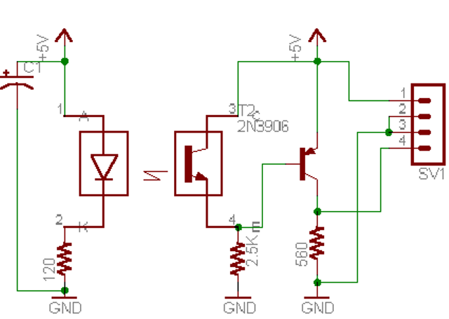 First picture shows my prototype after etching. Not very pretty, but it does the job. Second picture shows the board assembled. The OIS can be seen on the left of the picture. Third picture shows the optoboard (tm) and counter connected together with a small cable. The cable has 4 conductors that carry 1) 5 volts, 2,3) ground 4) signal. Testing in my lathe proved the circuit works as expected. Ideally a wheel with 10 slots would be used as to improve the accuracy at the low frequencies. The schematic can be seen here here. As per the datasheet on the opto interrupter switch, the diode is biased with a 120 ohms resistor. For best transfer, the resistance in the npn output transistor is specified at 2.5k. The transistor is constantly on, unless the beam is interrupted. As the npn output transistor is always on, over 4 volts are present at its emitter. This voltage (>4) keeps the pnp transistor off at all times. Its output, taken from the emitter is at ground level. When the opto switch beam is blocked, the npn output transistor stops conducting. This causes its emitter voltage to drop to ground level. This forwards biases the pnp output transistor into full conduction. The output goes up close to the power supply (Vcc minus the saturation voltage). The printed circuit can be seen here