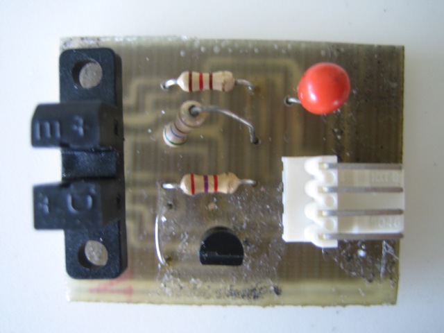 Finally I got some boards professionally made. They are single sided an about 1.5 X 1". If you are interested, I will sell these assembled for $10.00 which includes the shipping. The optoboard can be used as a limit switch or as the sampling board for the tachometer. it's max frequency response is around 16,000 Hz. How does it look?. Well, look at the picture above of the prototype. That is what it looks like.