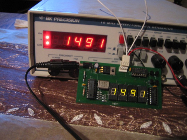 The first picture shows the bare printed circuit board. The next picture shows the board assembled. The last picture shows my creation displaying a known frequency from a commercial signal generator. Both displays show the same frequency. Not bad!!! After my design goes through a rigorous testing face in my hot garage, I may offer the bare pcb for a nominal fee to cover manufacturing expenses. The size of this board is about 2 by 4 inches. The code will be offered free. You can program your own pic microcontroller or I can sell you one programmed for a nominal fee. It uses a 16c84 micro running at 4 mhz. Four 7 segment led displays, four pnp transistors, two ttl ic's and a few resistors and capacitors is all that is needed. If there is enough interest, a full kit may be offered. The schematic can be seen here.